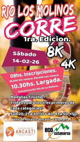 Este sábado 14, desde las 10.30 y la Villa de Ancasti, en el departamento Ancasti, se hará la 1ra edición de “Río Los Molinos corre” sobre 4 y 8 Km.
